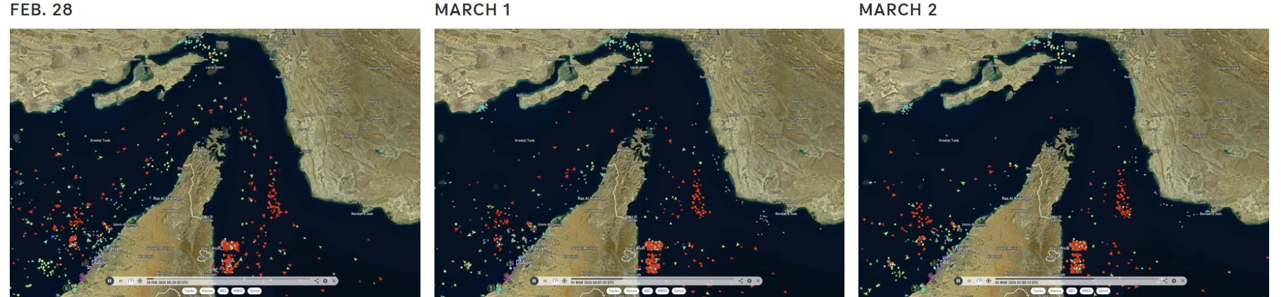 2月28日至3月2日,霍尔木兹海峡的航运放缓对比。NPR截图