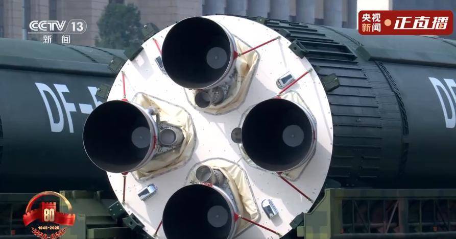 气势磅礴的核导弹第二方队接受检阅。“东风-5C”液体洲际战略核导弹亮相,打击范围覆盖全球。
