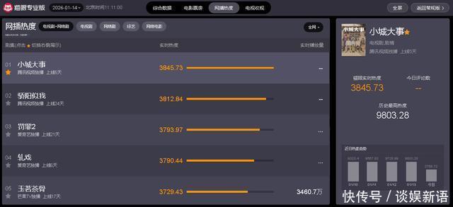 截止发1月14日中午11时11分,从“猫眼专业版”实时数据显示可知,当前热播电视剧中,网播热度最高的五部剧分别如下: 1、《小城大事》 主演:赵丽颖/黄晓明/陈明昊 剧情点评:好久没遇到一部能让全家围在电视前一起追的剧了,《小城大事》绝对是2026开年最大惊喜!作为央视推出的年代奋斗剧,它没有走“苦大仇深”的老套路,反而用满屏的烟火气和热血劲,把80年代“农民造城”的传奇故事讲得既好哭又好笑,越看越上头。剧情节奏也拿捏得恰到好处,用轻喜剧的方式消解了年代剧的沉重。更难得的是剧中的群像塑造,没有绝对的主角光环,每个人物都有血有肉。所以总的来说,《小城大事》绝对值得一看,相信你会和我一样,被这份纯粹的热爱与坚持深深打动。最后,强烈安利没看的观众,都去看看。 2、《骄阳似我》 主演:宋威龙/赵今麦/林依轮 剧情点评:顾漫还是太会把家国情怀,时代创新和细腻的感情戏糅合在一起。尤其是每一个熠熠生辉的群像,更是给电视剧增加了很多可看的点和骄阳宇宙的观众信服度。而且比起书,剧本里姜云女士的角色真的让我眼前一亮。金巧巧的演绎让这个角色饱满,也让我们看到了真正的女强人是怎样的。不是用流言把自己困住,不是用一生去自证一些无所谓的言语,而是能时刻反思与进步,能通过自己的能力去继续奋斗,成为女儿坚强的后盾和底气,这样的中年女性在我看来是极具魅力的。所以总的来说,观剧体验还是非常舒适的,希望顾漫再多写写! 3、《罚罪2》 主演:黄景瑜/王传君/梁洁 剧情点评:《犯罪2》以少女失踪案为引,勾勒英式硬核罪案图景。杜格雷·斯科特演绎的侦探深陷过往心魔,凭炸裂演技斩获大奖,角色张力拉满。剧集兼具粗粝质感与黑色幽默,深挖人性幽暗,双季叙事层层递进,在悬疑外壳下叩问正义与救赎,尽显英式罪案剧的独特魅力。而且这个结局比我想象中要好,起码秦枫和麦洪超都是没事的,彭局还有弘沐寿都被抓了。结尾把这个徐丽案的整个流程又回顾了一遍,让观众彻底知道当时事情发生的完整过程,也算是进行了一个首尾呼应吧。所以总的来说,这种片子总会让人心潮澎湃,值得一看! 4、《轧戏》 主演:陈星旭/卢昱晓/代旭 剧情点评:简直就是成熟爱情的理想范本!职场上是“伯乐型引导”:胡羞深陷建筑梦瓶颈自我怀疑时,他精准捕捉其设计天赋,主动递上关键面试机会,用“我看到了你的可能性”击碎她的不自信,比情话更有力量。生活中是“温柔型引领”:她被前男友一家刁难时,果断撑腰护场;她与家人争执封闭自我时,不说教只安静陪伴引领;连误会都选合适时机坦诚解释,从不用冷暴力消耗彼此。这种引导从不是居高临下的指导,而是“我懂你的难,也信你的好,还愿陪你慢慢变好”。所以总的来说,这样的偶像爱情剧是值得大家去一睹为快的,甚至追剧到底。 5、《玉茗茶骨》 主演:侯明昊/古力娜扎/陈若轩 剧情点评:最讽刺的是“茶文化”,宣传时吹得天花乱坠,正片里炒茶斗茶只是走流程,连茶百戏都成了破案工具,半点没体现茶道内核,纯属挂羊头卖狗肉。而且剧情和台词整体有点太照猫画虎一些著作了,所以显得很矫情;还有男主仿佛演成了一个古灵精怪的美女配资炒股网股票,emmm虽然是女本位的剧,但多少有点不适应。唯一能看的只有刘雪华的演技,可惜老戏骨也救不了这破碎的剧情和工业感的制作。建议剧组下次别凑名字拗剧名了,先把剧本逻辑和审美在线再说。所以总的来说配资炒股网股票,两星给女主,没想到娜扎演的还不错,其他的真的让人一言难尽。