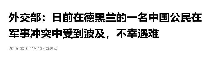 根据目前中国外交部所发布的消息,这次在伊朗的冲突中已经造成了1名中国公民不幸遇难。